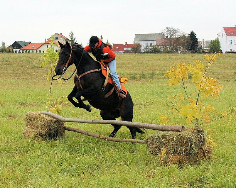Překážky byly připraveny od každého něco, skoky anglie a slalom, couvání a házení míčku z barelů western :-) Za každý tým se určili čtyři jezdci a ti jeli na štafetu v co nejrychlejším čase. První jela Petra, pak já, Jíťa a nakonec jsme si zvolily Tomáše s Polinou z Litvínova. Westerňáci ukázali, že se překážek nebojí a o 1 minutu měli rychlejší čas k potěšení nás všech :-)