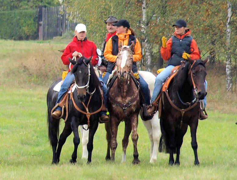 Včera 6.6.2009 se konal na ranchi Fox Riders v Lučním Chvojně Smart Fox Trail. Něco jako orientační běh, pomocí kompasu a indicií, akorát na koních. Jelo 8 čtyřčlenných týmů a ten náš měl pracovní název Mcleodovy dcery :-) Já, Jitka, Alena a Petra. Na ten den hlásili přívalové deště, ale počasí nám docela přálo, bylo pod mrakem, tak akorát pro koníky...V 9.09 byl slavnostní nástup na koralu a tam všichni dostali prvni indicii, aby se vědělo kam jet...Moc jsme se na tento závod s holkama těšily, připravovaly koníky, učily se s kompasem, a doufaly, že máme všeobecné znalosti k luštění indicií...představovaly jsme si to jako na táboře, orientační běh, s rozdílem, že nás naši čtyřnozí miláčci v co nejrychlejším čase donesou spolehlivě do cíle.... Velký OMYL.....První indicii jsme luštily snad přes hodinu, možná i víc, na koralu spolu s dalšími ostatními týmy. Bylo to opravdu dost náročné, na tom se shodli snad všichni....Nicméně po několika nápovědách za tresné minuty jsme se dohrabaly k vyluštění, a jako druhé vyjely za další indicií na zříceninu Blansko...Tam jsme byly ještě vysmáté, protože nás pořadatelé ujistili, že tak těžké, jako první úkol na ranchi, už to rozhodně nebude..... Další velký OMYL.....Měla to být 30km dlouhá trasa, my najely snad 60km, ne-li víc, s mnoha přírodními nástrahami, v kraji, kde z nás nikdy nikdo nebyl...Indicie byly dost složité, některé týmy to vzdaly již v průběhu závodu.. ostatní včetně nás dojely, ale správně nevyzvedly všechny po sobě určené... Jen jediný tým místních, sice dojel jako poslední, ale vyzvedl všechno a tím vyhrál. Pro nás byla výhra, že jsme se vrátily zdravé ,živé,a hlavně koníci v pořádku, protože některé úseky, mohly dopadnout velmi zle.Po příjezdu jsme s dalšími účastníky probíraly a luštily zpětně, kde byla chyba, a nakonec se nám vrátil úsměv do tváří, protože všichni to cítili podobně... Večer hrála pěkná country hudba.. Byl to zvláštní den ztrávený v sedle , na který s holkama nikdy nezapomeneme, i když se smíšenými pocity :-) Nějaké foto ze začátku