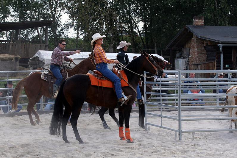 19-21.06.2009 naše první opravdové Rodeo s kravičkama.. Bylo to 3.kolo Ranch Rodea ve Westernovém městečku Halter Walley u Plzně. Cley panická hrůza z krav všeobecně, mě v pátek, kdy jsme tam dorazily, vyděsila tak , že se v sobotu nebudeme moci zůčastnit ani barelů, na které jsme byly přihlášené.. Druhý den od rána, jsme si zvykaly mezi stádem, při číslování telátek, a kobča se zdála být v jejich přítomnosti už docela v pohodě.. Nakonec jsem se dohlásila ještě do jedné dobytkářské disciplíny, Cattle Penning (oddělení telete od stáda na rychlost). V sobotu nám mrška telátko, vždy proklouzlo a vrátilo se zpět, ale v neděli jsme ho oddělily do ohrádky něco kolem čtyř sekund. Pro mě to byl obrovský úspěch, když pomyslím na to, co Clea v pátek po příjezdu dělala... Vyzkoušely jsme si zase něco jiného a mě to moc bavilo,.. Potkala jsem tam fajn lidičky, jako jsou pořadatelé a majitelé Halter Walley, nechyběla ani Markétka Brejlová s Metíkem a jejich sponzorem Maxem Hakenem, majitelem Pinta western krámku, taky skvělý pár Janču a Libora Doležalovi s jejich koníky a fajn fotografa Láďu Vogeltanze, od kterého mám zatím fotečky a na všechny z té akce se můžete podívat ZDE Byl to výborný víkend a už teď se těším, až tam opět vyrazíme ..